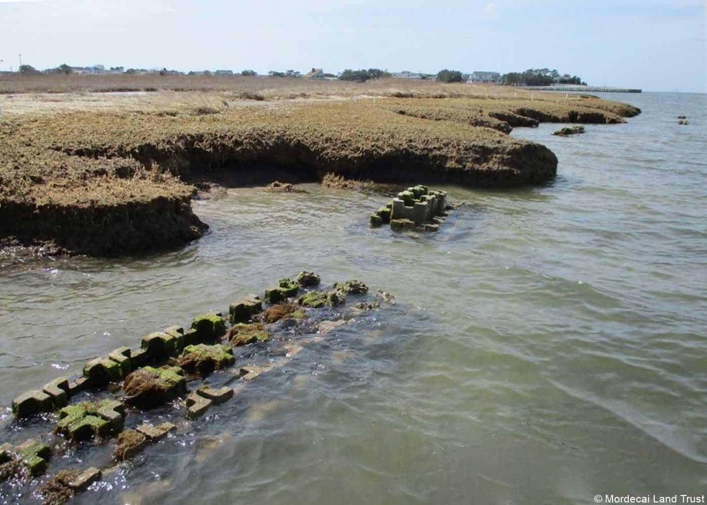 Purpose: A breakwater structure designed to mitigate shoreline erosion by decreasing wave action and increasing sedimentation. Provide a suitable habitat for oyster growth.